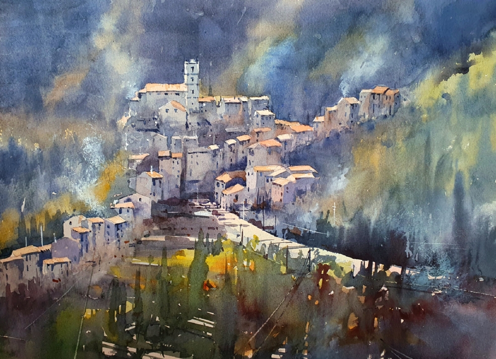 He considers himself to be a watercolour impressionist, aiming to capture the feel and atmosphere of a subject, rather than concentrating on too much detail. On materials, he believes strongly that watercolour is difficult enough without making it harder by using anything other than the best materials, especially paper: