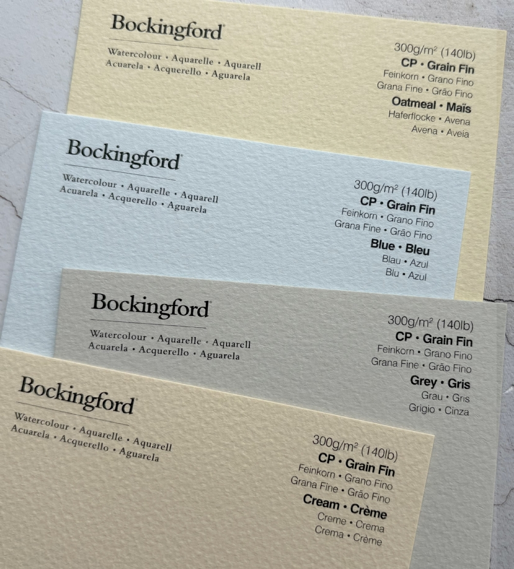 In addition to the standard ‘white’ shade of Bockingford®, there are also four exciting colours in the Bockingford range, including Blue, Oatmeal. Grey and Cream.