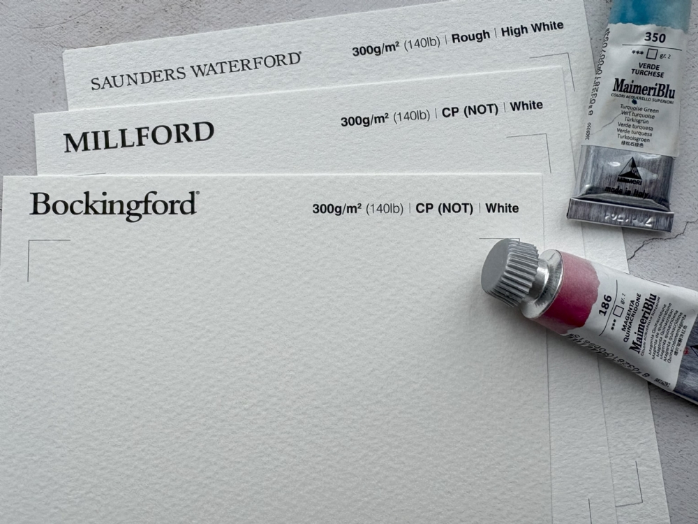 Both Bockingford® and Millford watercolour papers have a bright whiteness value to the paper's tone. Similar to the Saunders Waterford® High White, they will give a luminous feel for a fresher, more modern look.