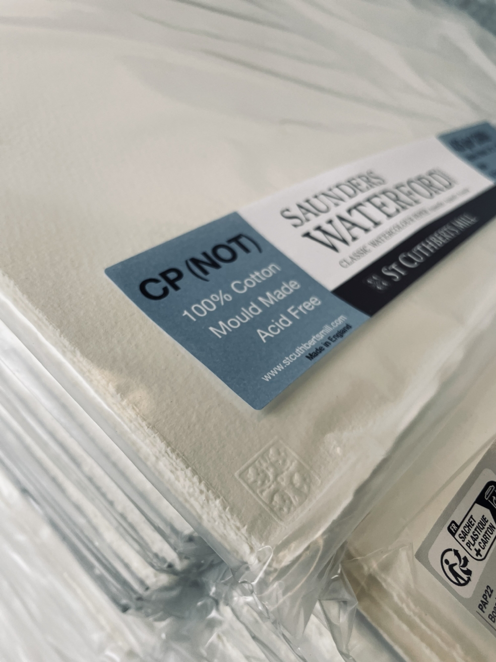 Storing your paper in its original packaging is the simplest way to protect it. Pads, blocks, and sheets are packaged to shield against dust, dirt, and physical damage, and keeping them wrapped helps prevent exposure to light and environmental contaminants. All the packaging supplied by St Cuthberts Mill has been tested to ensure there is nothing that can be detrimental to the paper inside, from the printing of the pad covers to the adhesives from the labelling.