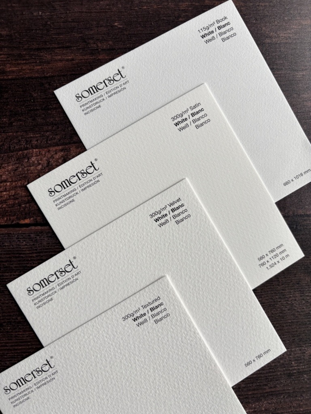 All Somerset® printmaking papers share the same core qualities: 100% cotton, Mould Made construction, excellent strength when damp, and a surface engineered to perform under pressure. What changes between Book, Satin, Velvet and Textured is not what techniques can be used, but how the surface responds to ink, pressure and handling.